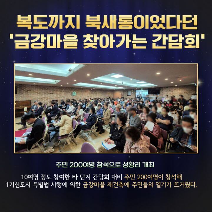출처_금강마을 호갱노노 최근 진행한 주민간담회 및 작년 통합재건축 발대식 이미지 등을 미루어 보았을 때, 부천 시청 및 경기도 국회의원, 대형건설사에서도 큰 관심을 갖고 있는 단지인 것 같습니다. 그리고 가장 압도적이었던 부분은 '주민참여율'이었습니다. 대부분의 행사에 주민들이 꽉 채운 모습을 보고 속된 말로 '난놈이다'라는 생각을 했습니다.