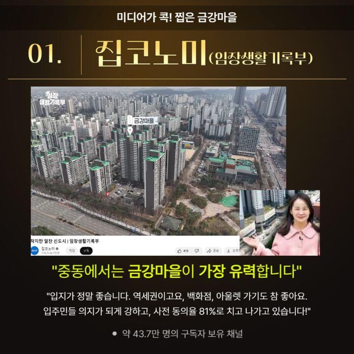 출처_금강마을 호갱노노 현재 사전동의율이 81%로 주민들의 관심과 열기가 뛰어난 단지입니다. 금강마을이 1,962세대라는 점을 고려해봤을 때 실로 어마어마한 동의율이 아닌가 싶습니다. 그래서 그런지 유명 유튜브나 공영방송 등에도 출연한 것으로 보입니다. 또한 부천 중동에서 가장 먼저 통합재건축을 선도한 단지 자격으로 대통령 간담회 등에 부천 중동 대표로 참석했다고 합니다.